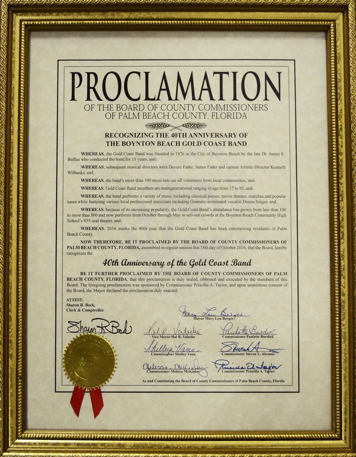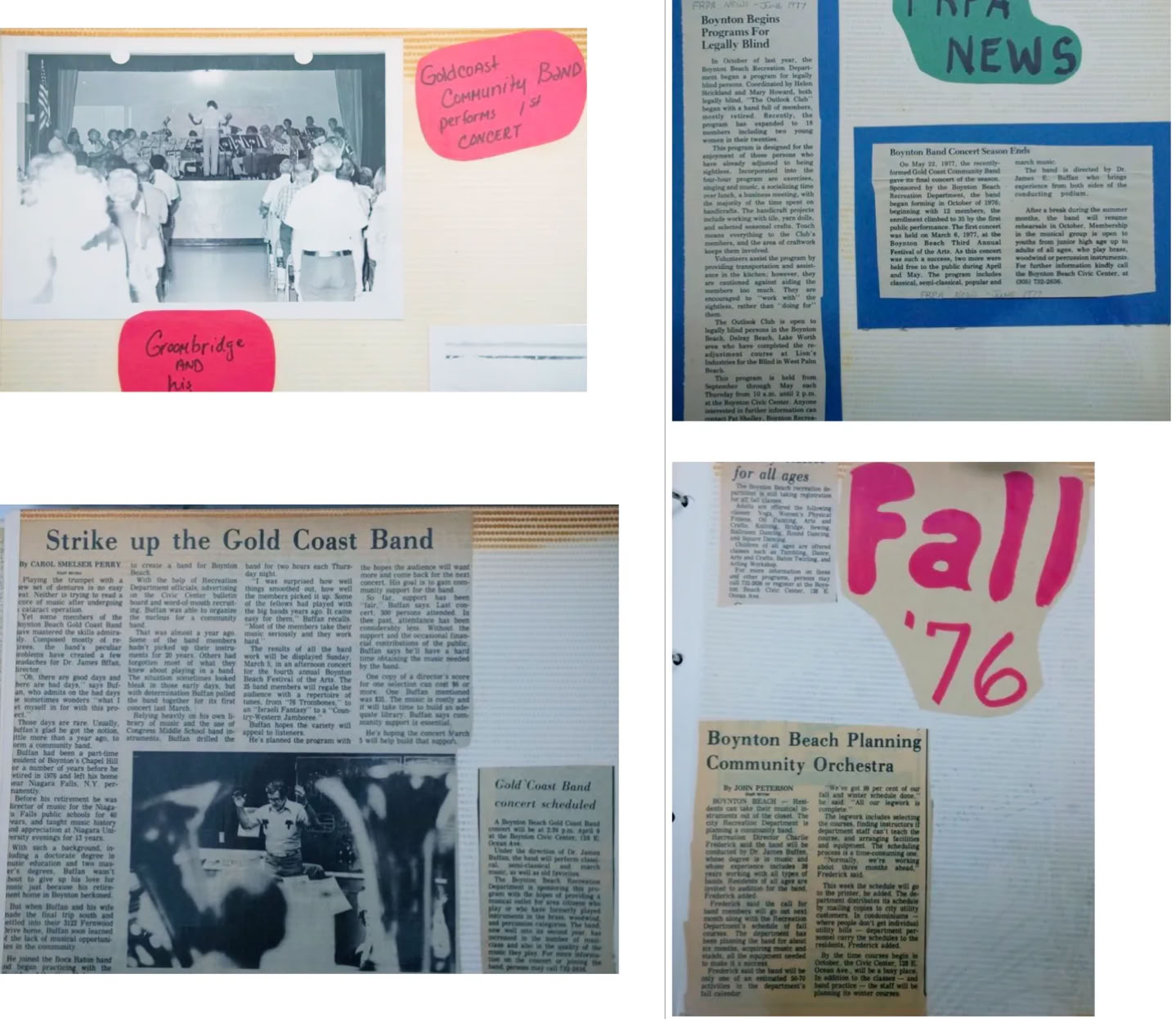 The Gold Coast Band is a municipal community band proudly supported by the City of Boynton Beach, Florida. The band was founded in 1976 by the late James E. Buffan, PhD. Dr. Buffan and his wife, Lee, came to Boynton Beach from Niagara Falls, N.Y., where he was director of music for the city`s public schools. He also served as a music teacher on the faculty of Niagara University.